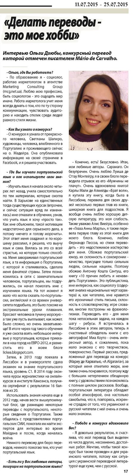 3. Заняла первое место за перевод на русский рассказа Мариу де Карвалью "Кирпичный язык" в конкурсе недипломированных переводчиков.
